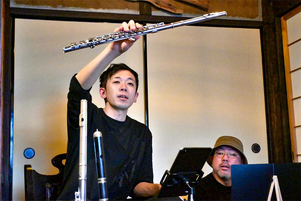 次は逆に、これらの作品を基にして音楽を構想していきました。『二人静』や『小夜時雨』は勿論、他の楽曲も大半は貫名さんの作品で描かれた植物を主題にしたものを選んでいます。また、伝統的な木造建築である会場に合わせ、金属製の普通のフルートよりも木製の伝統的な楽器であるロマンティック・フルートを積極的に使いました。