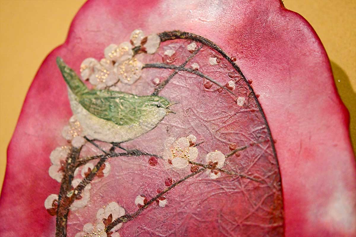 そして、この言葉から「鳥と植物」を主題に据えた作品というアイデアも具体化しました。「花鳥」は古来から日本美術の代表的な画題ですが、貫名さんの現代的な視点と技法により、伝統にのっとりながらも新鮮な作品群が生まれます。また、『二人静』や『小夜時雨』は、融解建築の同名の楽曲から着想された作品です。